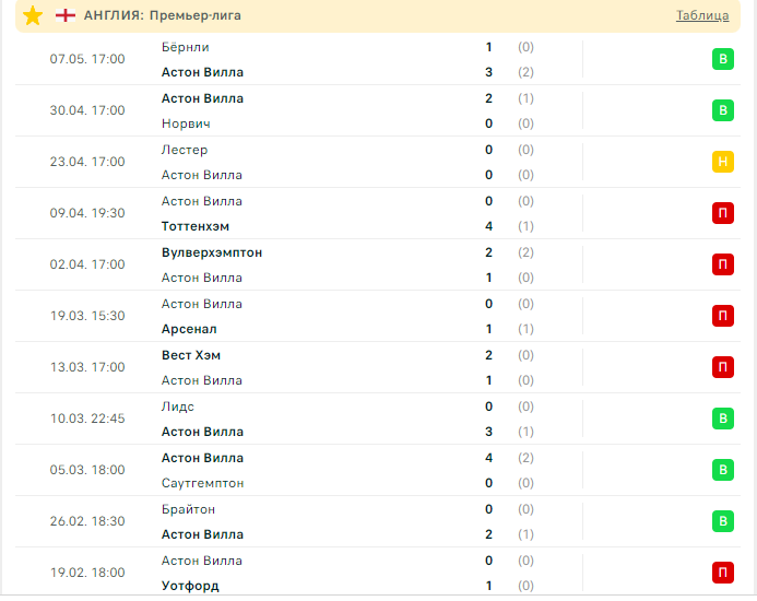 Посчитаем среднее количество голов за игру для матча «Астон Вилла» против «Ливерпуля». За последние 10 домашних матчей гости забили: