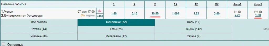 Для примера возьмем матч между “Челси” и “Вулверхэмптоном” в рамках Английской Премьер-Лиги. Вот какие кэфы предлагает букмекер: