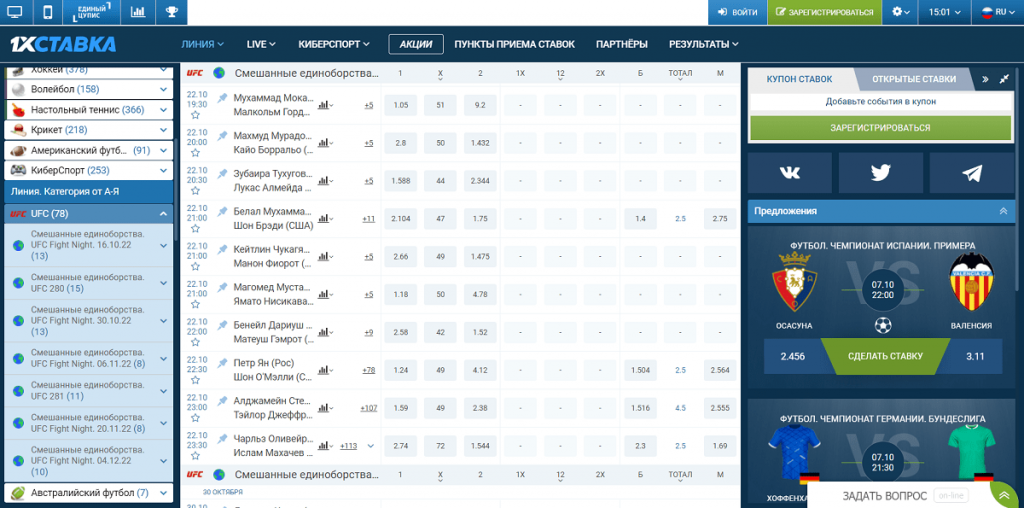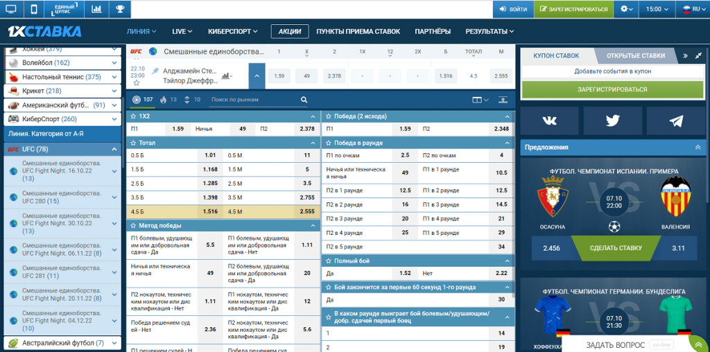 Как уже говорилось, легальный букмекер 1хставка выделил соревнования под эгидой UFC в отдельную линию, что позволяет легко и просто выбирать нужный поединок. В остальном принцип оформления пари стандартный. Нужно: