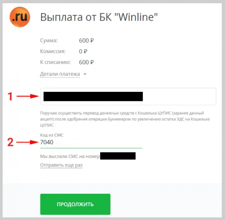 Для финальной проверки букмекер перенаправит беттера на сервис ЦУПИС. Для получения денег еще раз подтвердите платеж. На телефон придет код, который нужно ввести в соответствующее поле.
