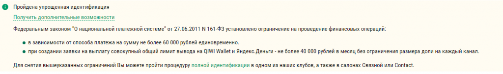 Для снятия ограничений необходимо пройти полную идентификацию. Сделать это можно в наземном клубе букмекера. Если поблизости пункта приема ставок на спорт нет, то можно верифицировать учетную запись в салонах «Связной» и Contact.