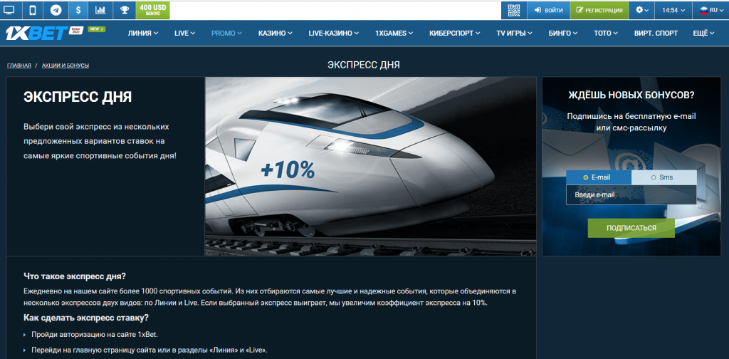 Каждый день аналитический отдел букмекерской конторы 1хбет собирает десять экспрессов из вероятных исходов и в случае выигрыша увеличивает прибыль по ставке на 10 % (добавочный коэффициент 1.1).