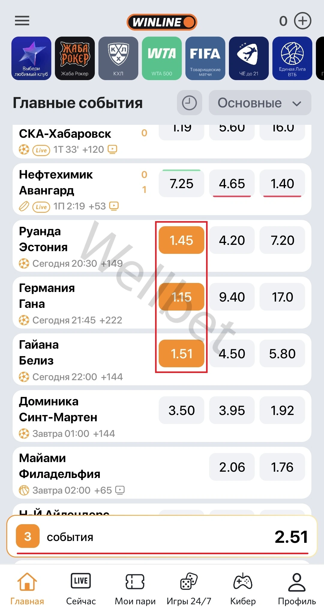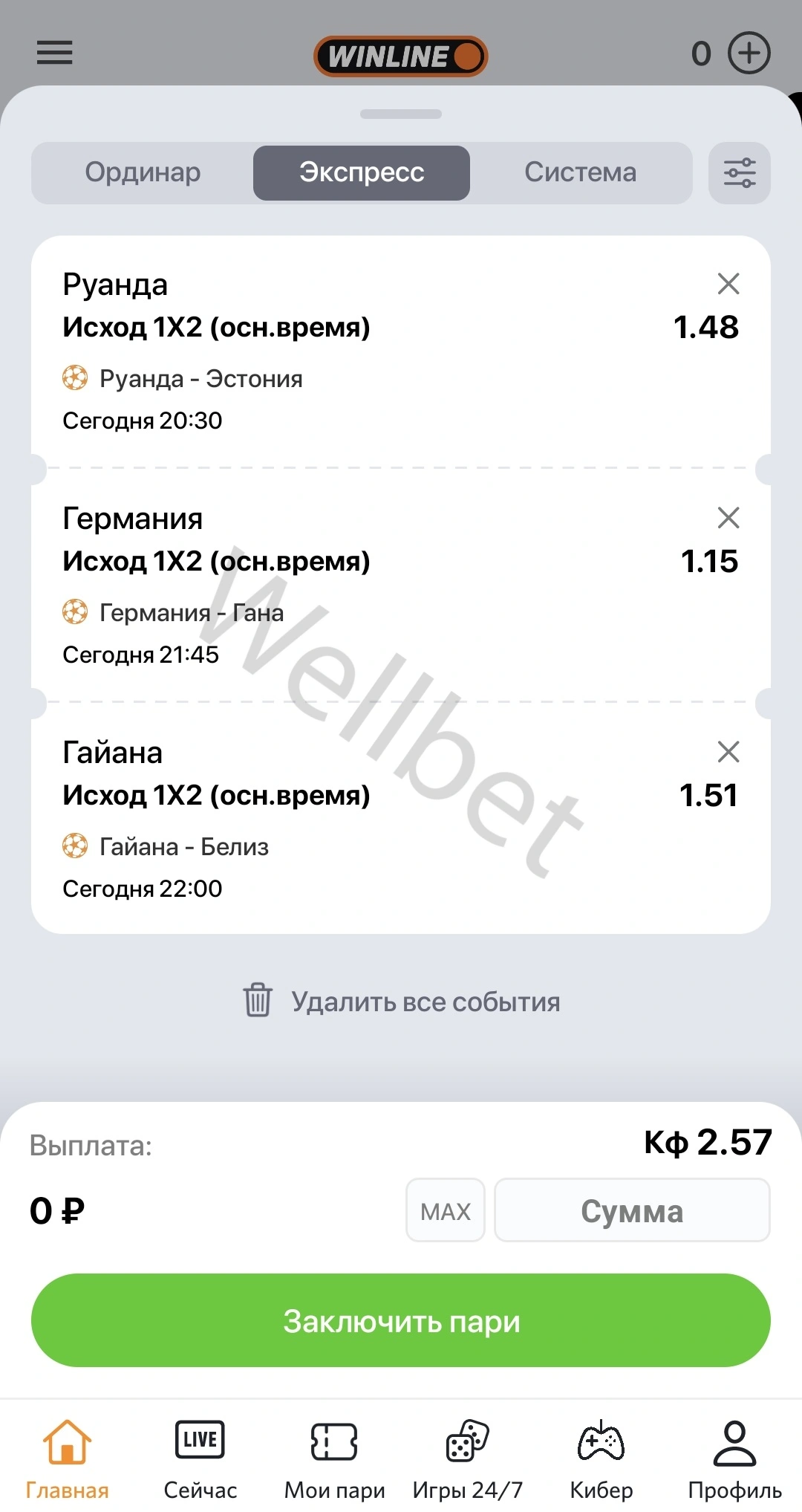 В некоторых букмекерских конторах есть исключения, например, можно брать исходы из основной росписи и статистики. В «Винлайн» такой подход не применяется.