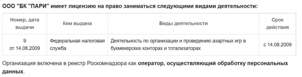 БК «Пари» законно занимается букмекерской деятельностью на территории Российской Федерации. Она работает онлайн на современной цифровой платформе. У букмекера есть разрешающая лицензия ФНС России, открыта информация об ИНН «Пари» («Париматч») и других документах.